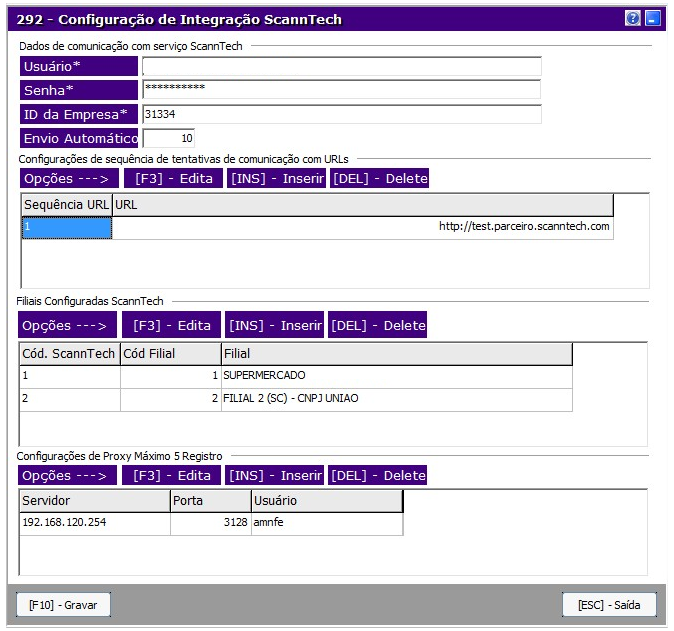 Solução: Solução: A tarefa 292 - Configuração de Integração ScannTech é utilizada para informar os dados disponibilizados pela própria ScannTech para possibilitar a integração de dados entre os dois ambientes.