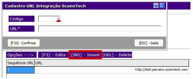 Inserção de URL's para integração WEB com a ScannTech, o importante na inserção destas URL's, é definir o nº de sequência. Ou seja, se a ScannTech disponibilizar mais de 1 URL, ao inserir esta URL, colocar o nº: