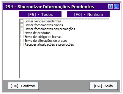 Enviar vendas pendentes - Força envio de movimentos de cupons vendidos. Por padrão, o envio de vendas lê o histórico de vendas de 60 dias adiante, e caso ter algum cupom não enviado para a ScannTech, o envio é feito. Caso o cliente queira forçar o envio, abrir a tarefa 294, marcar a opção e confirmar.