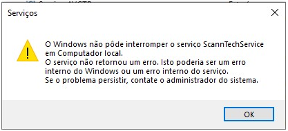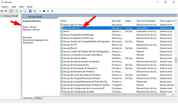 2° Na página que irá se abrir, é necessário selecionar o serviço ScanntechService e na opção ao lado, selecionar Parar o Serviço (Caso o serviço já esteja iniciado), logo depois clique em Iniciar serviço para reiniciá-lo, caso o serviço esteja desabilitado, selecione a opção ao lado Iniciar o Serviço