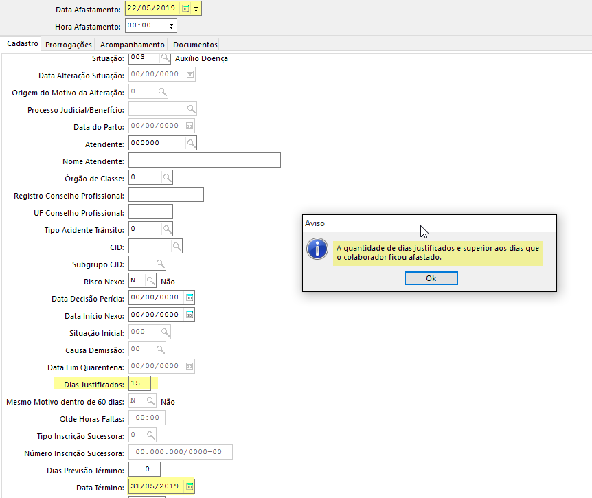Identificamos que o problema estava no cadastrado do afastamento, onde havia um afastamento de 10 dias e no campo dias justificados foi informado 15. OBS.: O sistema não permite efetuar o cadastro do afastamento nesta situação: ![]() |