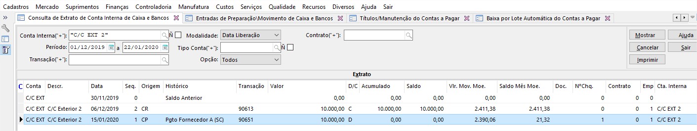 Problema: O saldo da conta interna em outra moeda não está fechando.