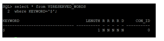 Para consultar todas as palavras/caracteres reservados do Oracle pode ser feito select na seguinte tabela: V$RESERVED_WORDS