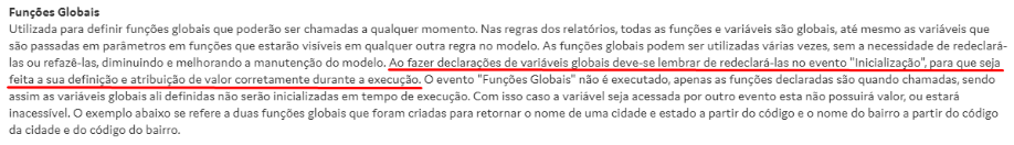1 - Inicialmente nos deparamos com a seguinte situação na customização das regras referentes às Funções e Variáveis Globais. Conforme documentação: https://documentacao.senior.com.br/tecnologia/6.2.35/index.htm#geradores/relatorios/secoes/modelo-gerador.htm