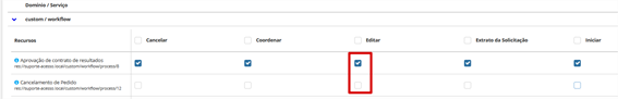 Marcar a opção Editar para os fluxos que deseja que apareçam para o usuário, os demais não devem ser marcados. Exemplo: