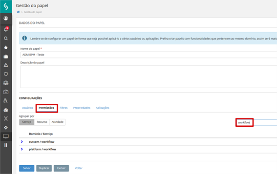 2 - Neste papel, acessar a aba Permissões e procurar por Workflow: