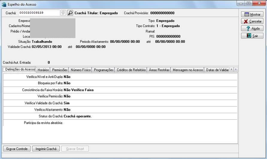 E caso o número dos crachás estejam iguais em ambas as telas, e também na tabela Controle, o fornecedor de hardware também deve ser acionado para verificar o porquê do bloqueio.
