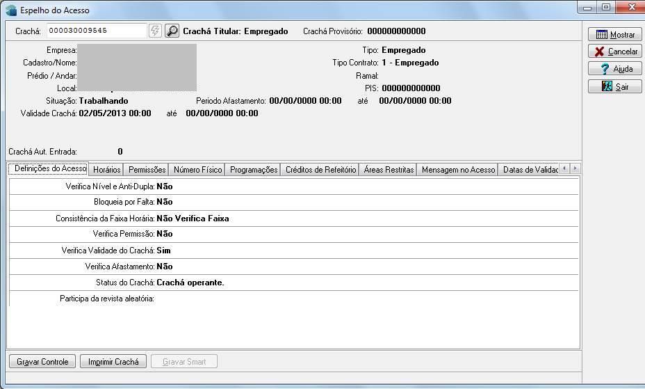 A consulta do crachá que está gerando esta mensagem pode ser feita pela tela de Monitoramento de Acessos (Supervisão/Monitorar/Acessos). E a consulta na tabela Controle deve ser feita pelo número do crachá que é informado no Espelho de Acesso (Acesso/Espelho de Acesso).