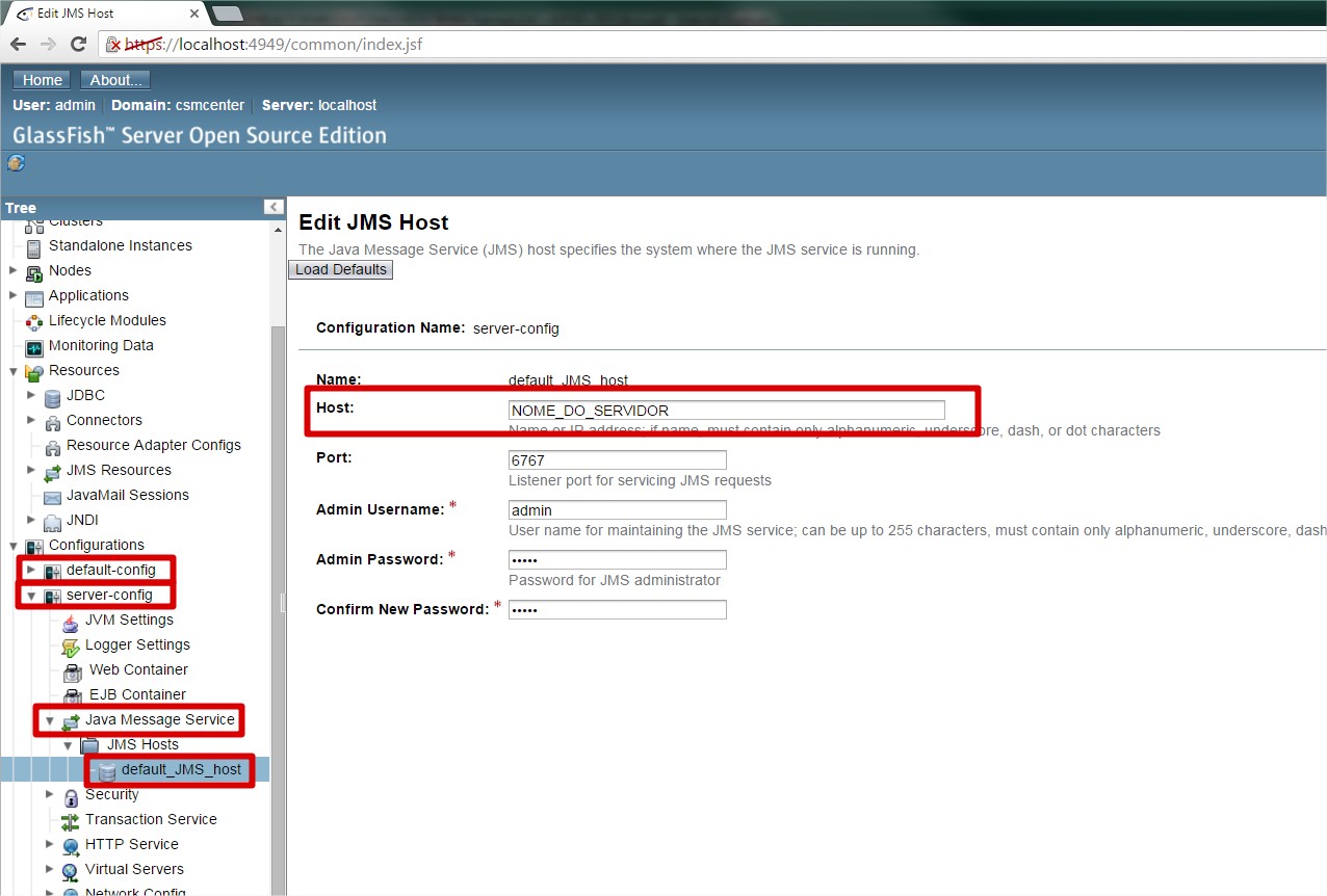 - Configurar também a guia Configurations/default-config/Java Message Service/JMS Hosts/default_JMS_host.