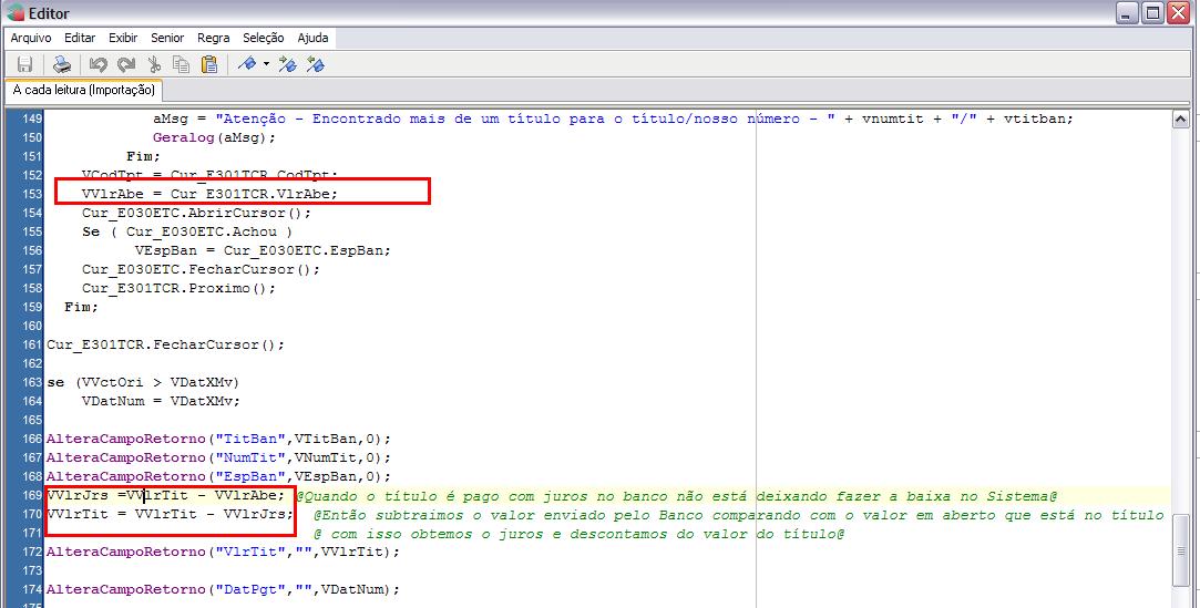 Solução: Solução 5556: Esta situação ocorre geralmente quando o Banco não envia o valor do campo juros no txt, porém lá no Banco foi cobrado com juros o título. Dessa forma ocorre divergência de valores com o ERP. Para solucionar a situação, pode ser feito um cursor na tabela e301tcr, e buscar o valor do campo VlrAbe e subtrair do VlrTit vindo do txt, com isso se obtém o valor do juros. Este valor deverá atribuir para o campo VlrJrs via AlteraCampoRetorno.