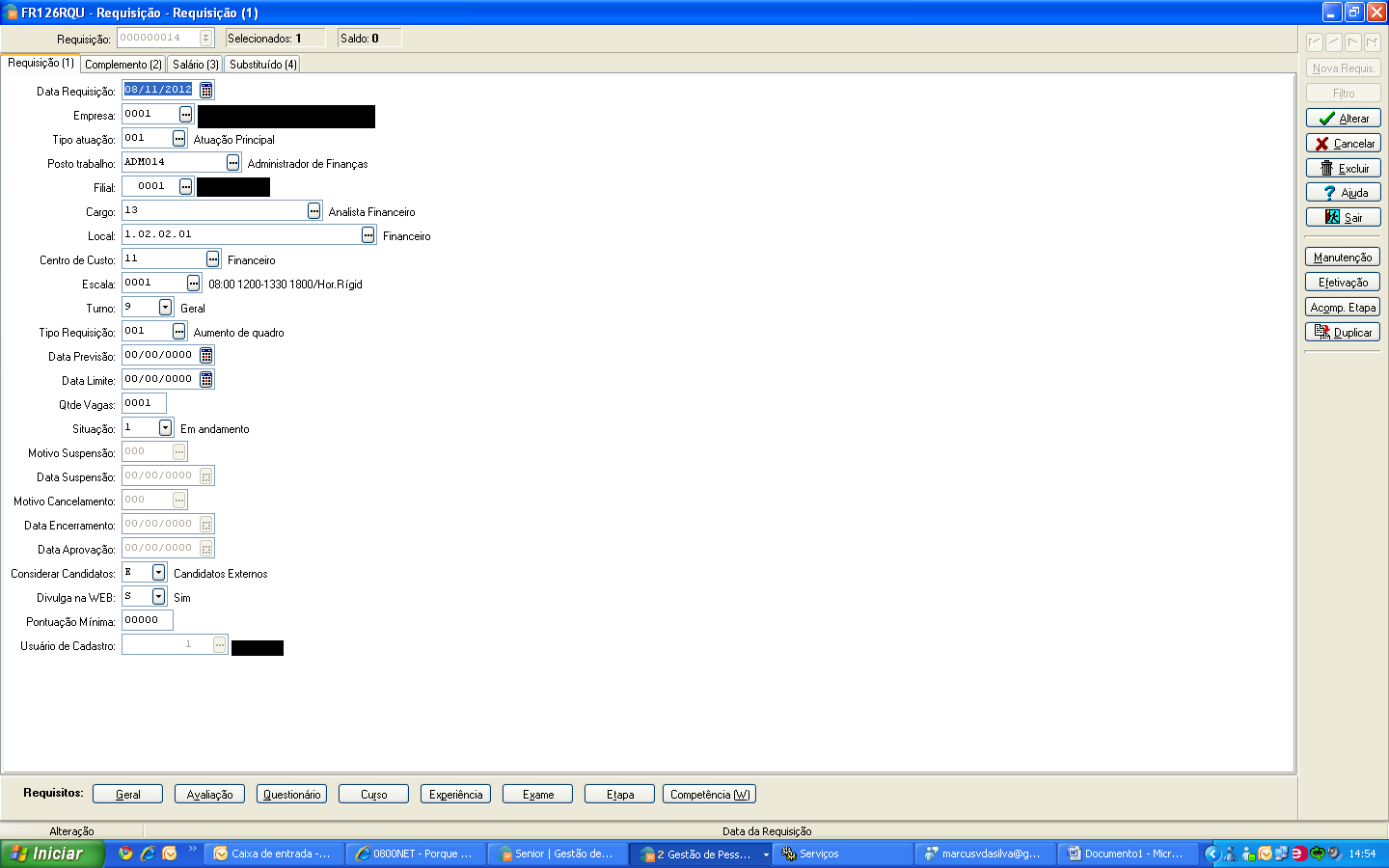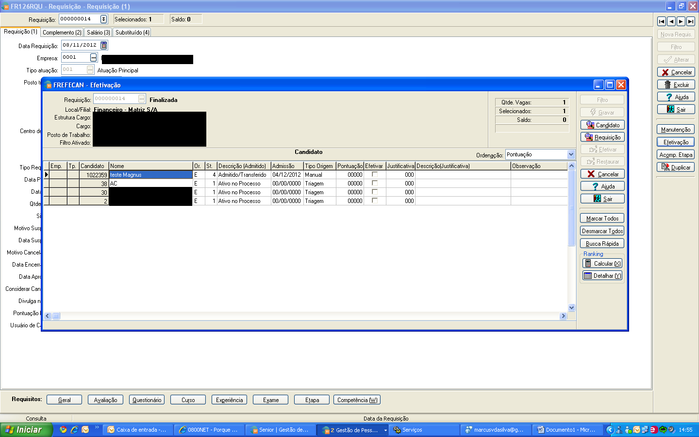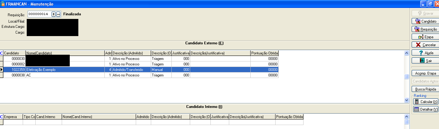 3. Acesse a opção Seleção / Manutenção, acesse a Requisição cadastrada no passo 2, inclua o candidato e salve;