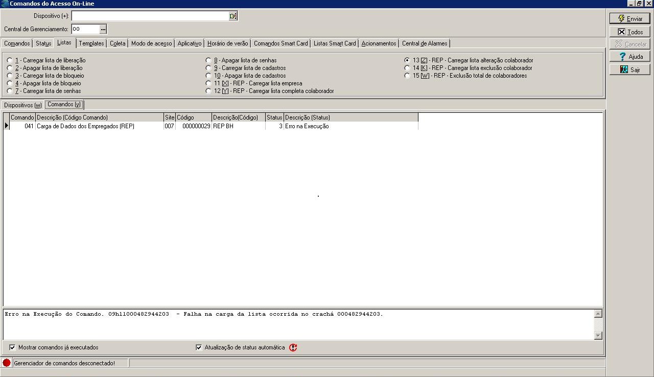 b. Enviar comando de lista 12 (REP - Carregar lista alteração colaborador) em Supervisão > On-Line > Comandos > Acesso > guia Listas.