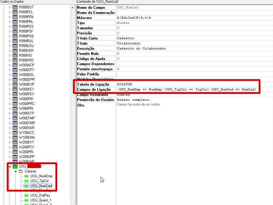 - Na tabela de usuário criada no tbs (USU_tabela) os campos chaves devem ter ligação com uma tabela do sistema. Exemplo em anexo.