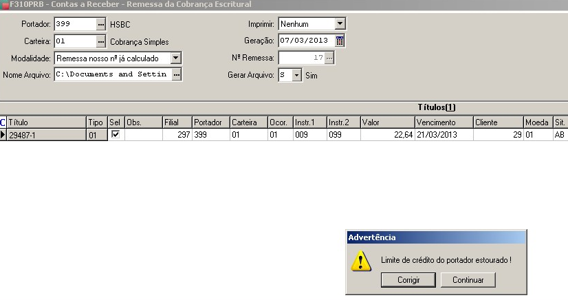 Problema: Quando tento gerar a remessa esta aparecendo a seguinte mensagem: Limite de crédito do portador estourado!.