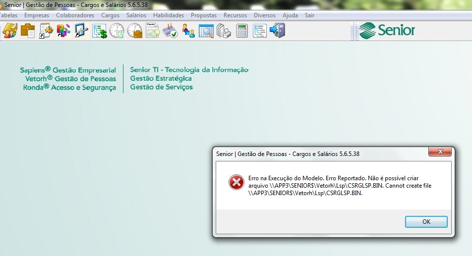 Problema: Após a atualização do sistema, ao executar qualquer relatório o sistema exibe a mensagem Erro na Execução do Modelo. Erro Reportado. Não foi possível criar o arquivo \\APP3\SENIOR$\Vetorh\Lsp\CSRGLSP.BIN. Cannot create file \\APP3\SENIOR$\Vetorh\Lsp\CSRGLSP.BIN conforme print anexo.
