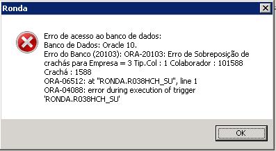 Problema: Ao cadastrar um crachá provisório ocorre a mensagem (anexo): Erro do Banco(20103): ORA-20103: Erro de Sobreposição de crachás para Empresa = 1 Tip.Col: 1 Colaborador: 1 Crachá: 1