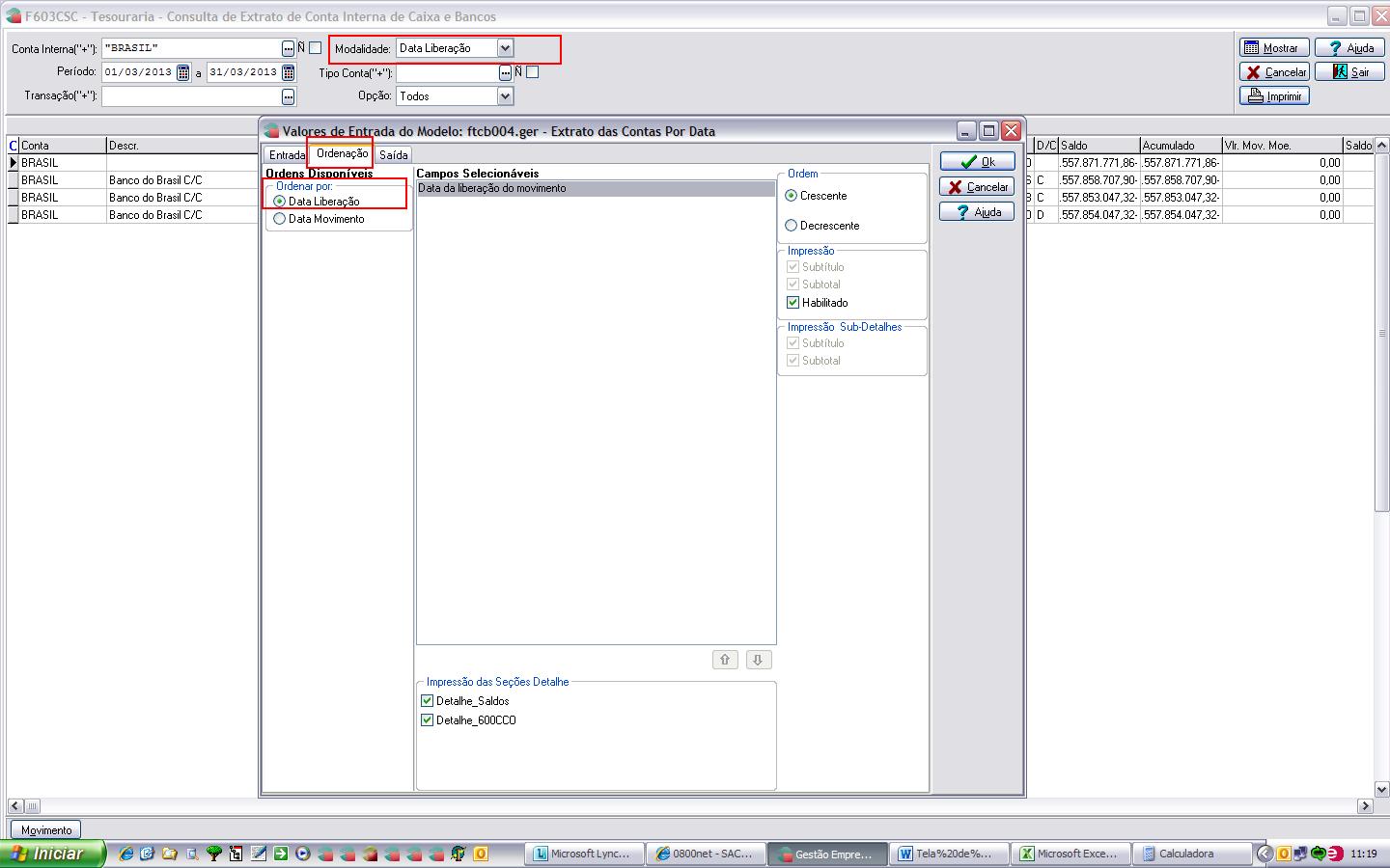 Outra questão que deve ser observada é quando você clica no botão Imprimir da tela, ao mostrar o relatório veja se você está escolhendo na ordenação data de liberação ou data movimento, pois a escolha tem que ser idêntica da tela.