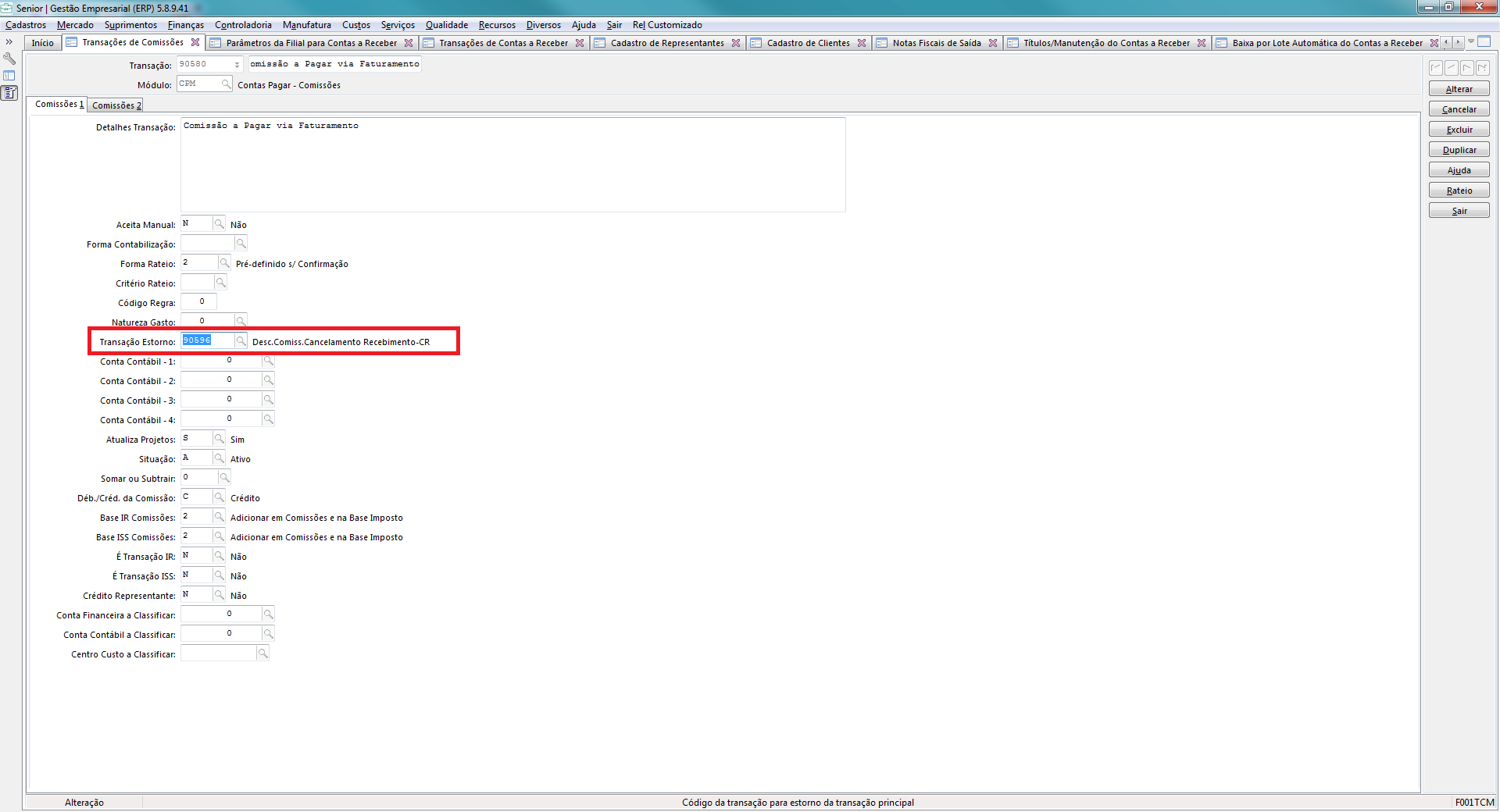 diferente daquela integrada à transação da nota fiscal de saída. Então na transação do título(F001TRE) deve-se verificar se há uma transação de comissão integrada.