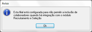 Esta filial está configurada para não permitir a inclusão de colaboradores quando há integração com o módulo Recrutamento e seleção.