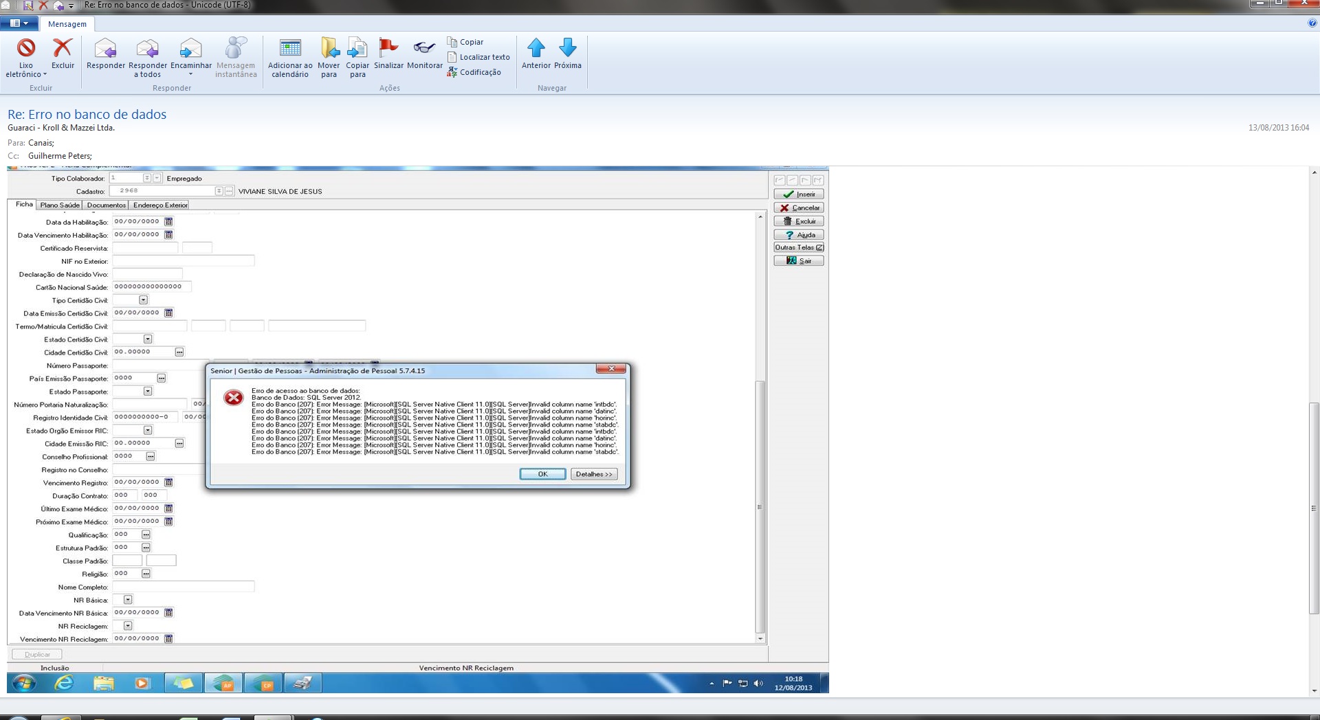 Mensagem de erro ocorre ao realizar o cadastro da ficha complementar no cadastro de colaboradores: