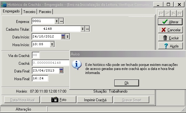 Problema: Ao finalizar hostórico de crachá de colaborador, ocorre mensagem Este histórico não pode ser fechado porque existem marcações de acesso geradas para este crachá após a data e hora final informada.. Anexo.