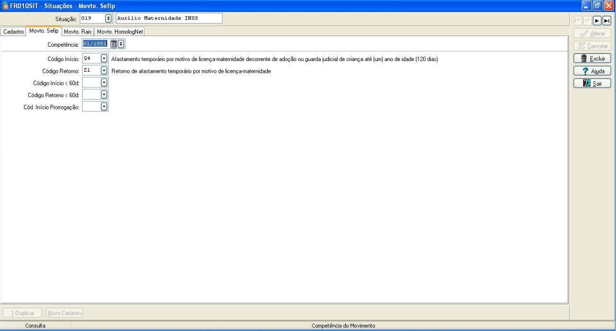 Solução: Orientamos neste caso, para que o SEFIP calcule corretamente apenas o valor do FGTS, no cadastro da situação 19 - Maternidade INSS, em Tabelas > Gerais > Situações, guia Movto. SEFIP, informar no campo Código Início a movimentação Q4 e no campo Cod. Início Prorrogação, deixar sem nenhum código.