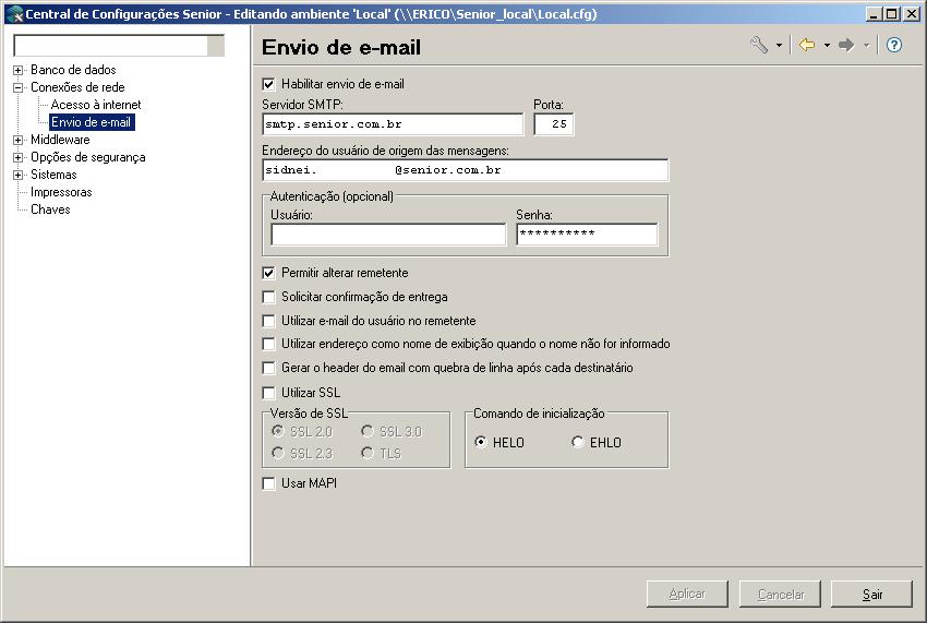 Solução: - Verificar se as informações para envio de e-mail estão cadastradas corretamente no SeniorConfigCenter, em Conexões de rede > Envio de e-mail. Anexo os exemplo.