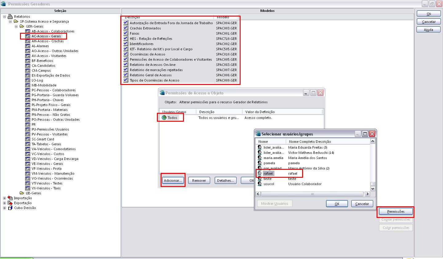 Após, selecione o grupo de Modelo (AB, AC, AH, etc.) em questão e na janela Modelos selecione todos os relatórios que devem ser liberados para o usuário em questão e clique no botão Permissão para atribuir a permissão.