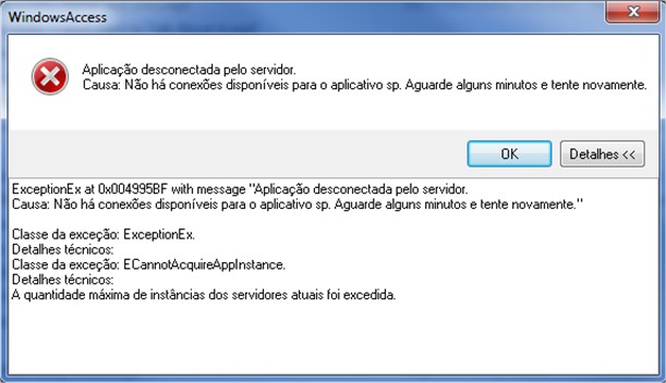 Solução: Esta mensagem informa que não há instâncias do Ronda Acesso disponíveis para uso, ou seja, foi atingido o limite máximo de instâncias abertas ao mesmo tempo.