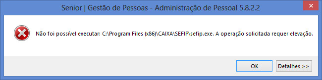 Problema: Ao processar a geração do SEFIP, retorna a mensagem Não foi possível executar: C:\Program Files(x86)\Caixa\Sefip\sefip.exe. A operação solicitada requer elevação. O aplicativo abre normalmente fora do sistema.