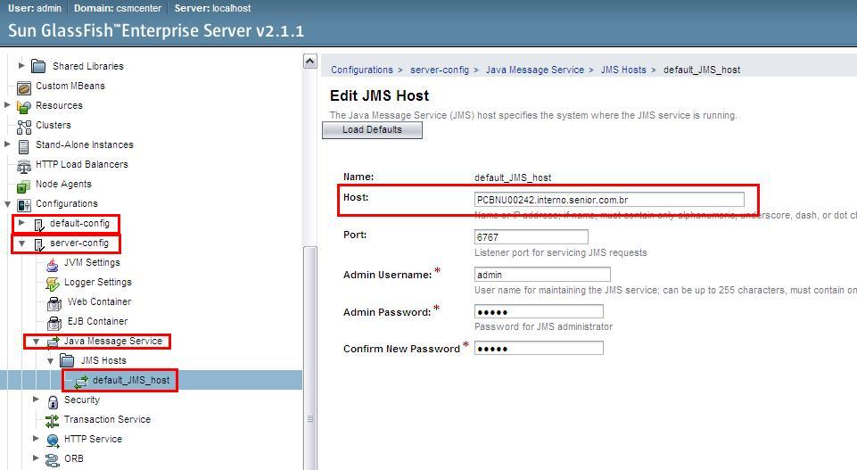 - Acesse o caminho Configurations / server-config / Java Message Service / JMS Hosts;