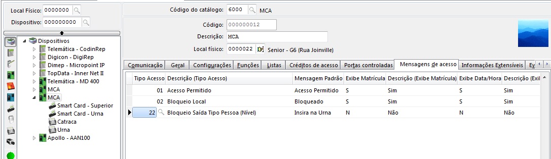 Para alterar a mensagem de acesso da leitora Superior, altere a Mensagem selecionando a leitora superior, guia Mensagens de Acesso (MensagemAcesso.jpg).