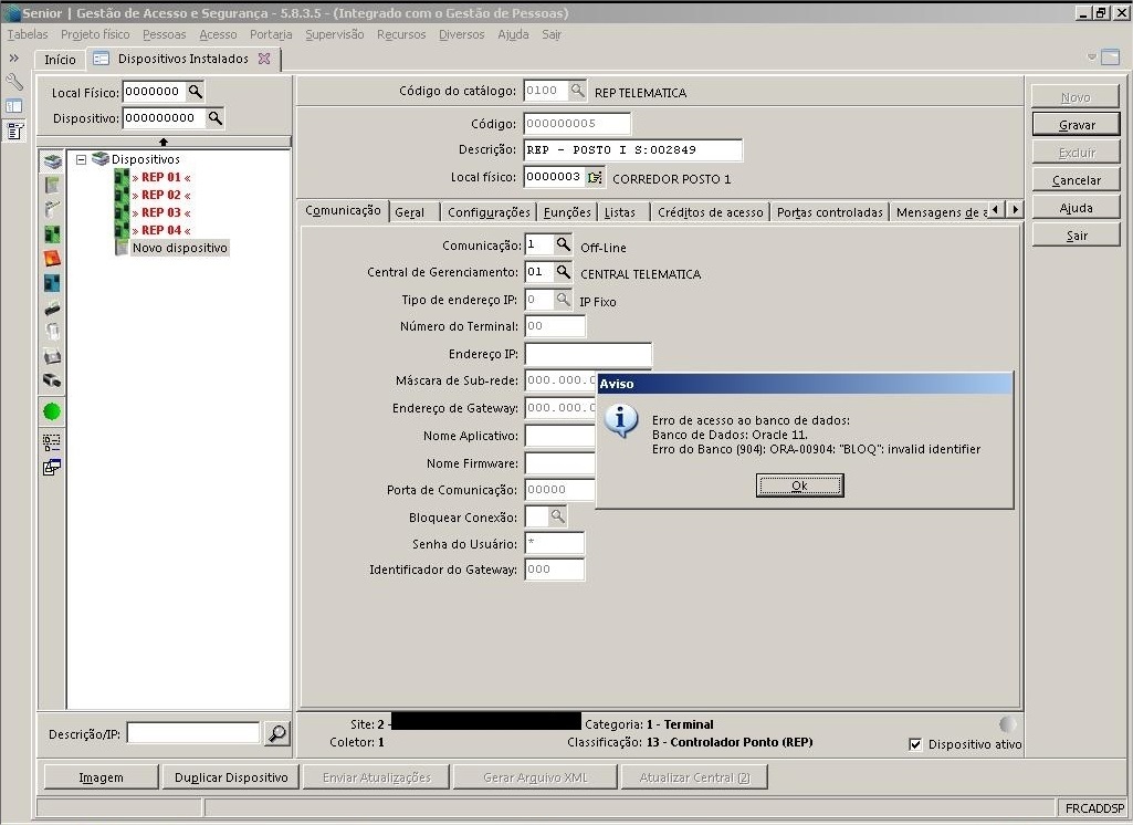 Ronda XT - Integração com Hardware - Erro do banco (904): ORA-00904: BLOQ: invalid identifier