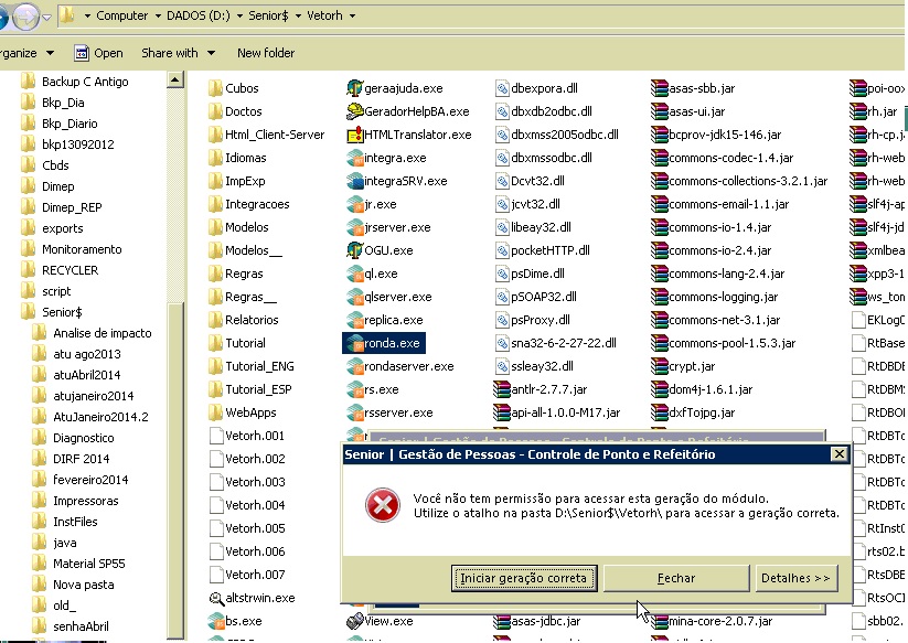 Utilize o atalho na pasta D:\Senior$\Vetorh\para acessar a geração correta.