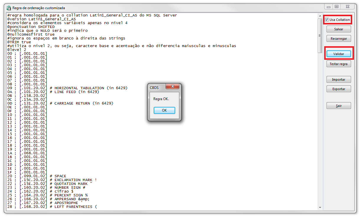 8. Após copiar a regra, marcar a opção Usar Collation e clicar no botão Validar;