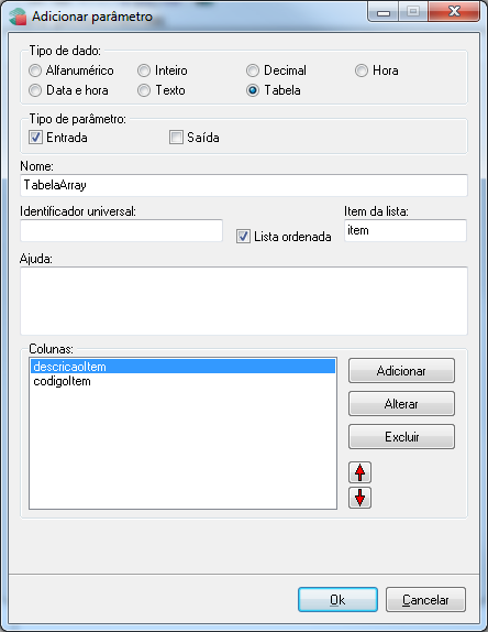 2. Cadastre o Web Service com o nome da porta como "MeuServico" e o parâmetro do tipo tabela chamado "TabelaArray", cadastrade os itens da lista como "item", com os parâmetros "codigoItem" e "descricaoItem".;