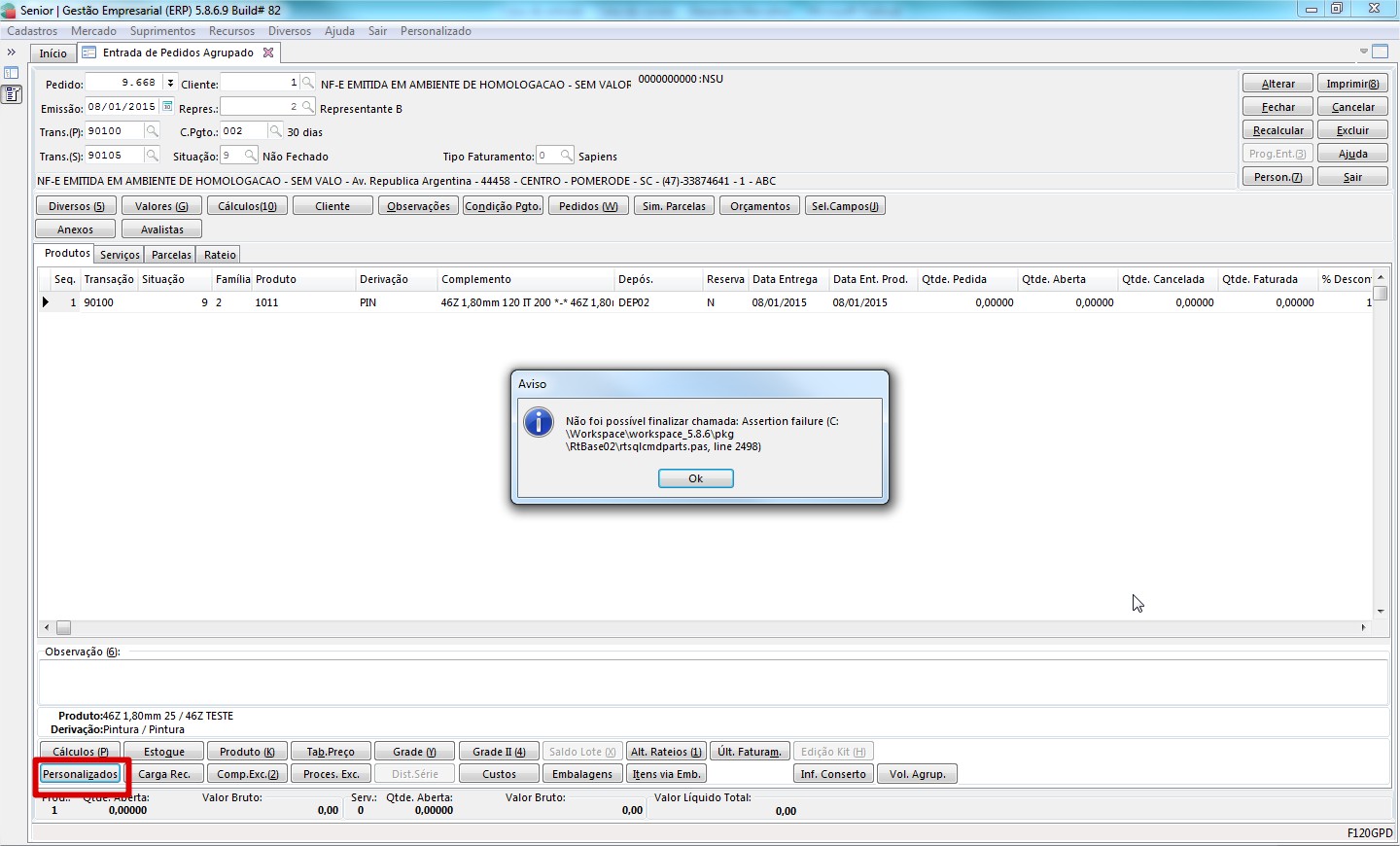 Ao clicar no botão personalizados dos itens do pedido, aparece a mensagem de erro abaixo e que também está no anexo.