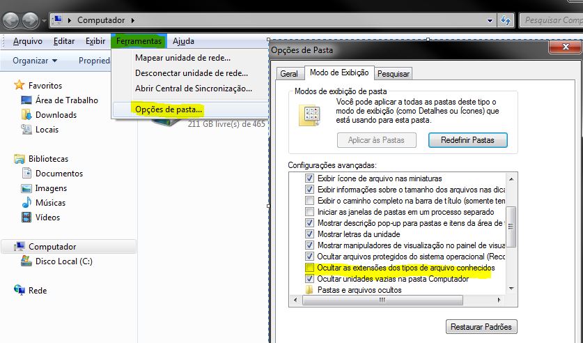 2. Clique selecione Meu Computador e clique em Opções / Modo de Exibição e desmarque Ocultar extensões dos tipos de arquivo conhecidos:
