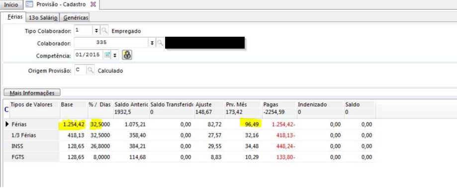 Desta forma, serão considerados os 32,5 dias acumulados no cálculo. Ou seja, o sistema vai dividir o valor pago na rescisão por 32,5 e multiplicar por 2,5, com isso acaba gerando um valor de provisão mês proporcional a estes dias acumulados e então gera um ajuste para fechamento do saldo.