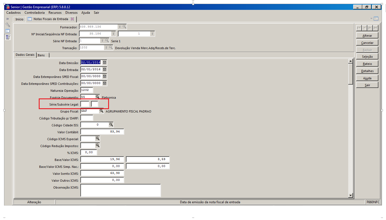 Tomando como base o exemplo acima, para que não seja apresentado erro de validação é necessário que na escrituração da nota fiscal de entrada através da tela F660NFC - Controladoria / Gestão de Tributos / Escrituração / Lançamentos / Nota Fiscal de Entrada deve ser informada a Série Legal igual a 1, para que no SPED seja gerado 001 no campo 07 do registro C100, deste modo, a série legal apresentada no campo 07 do registro C100 ficará compatível com a série existente na composição da chave eletrônica da nota fiscal. Em anexo, segue imagem exemplificando onde a informação referente a série legal deve ser informada.
