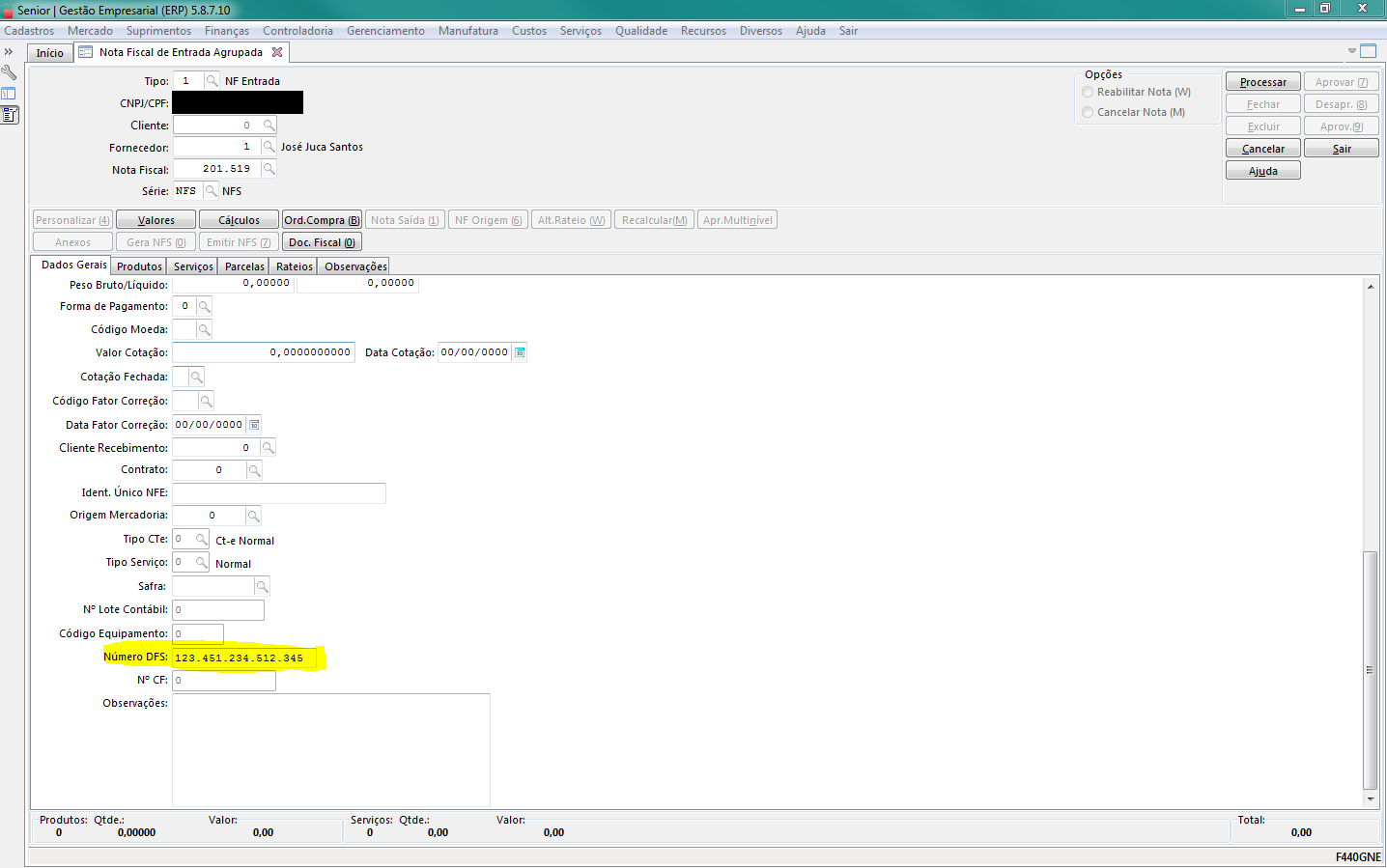 Esta informação será integrada para a Gestão de Tributos e considerada como o número do documento na geração de arquivos eletrônicos, como por exemplo o SPED quando a série utilizada para o lançamento da NF possuir o Dispositivo Autorizado = 8 - Nota Fiscal Eletrônica de Serviço no cadastro da série F020SNF - Cadastros / Mercado e Suprimentos / Parâmetros Fiscais / Séries Notas Fiscais / Cadastro.