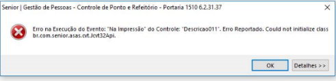 Problema: Ao executar um relatório ocorre o erro Could not initialize class br.com.senior.asas.cvt.jcvt32Api em anexo.