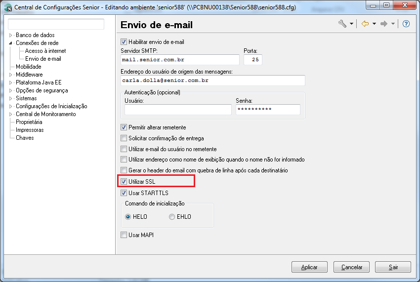 Solução 18802: É necessário verificar se no SeniorConfigCenter a opção Utilizar SSL está setado igual mostramos na imagem em anexo. Se não tiver é necessário setar para correção do problema. Após fazer a configuração devida, sair do sistema, reiniciar Middleware e refazer o teste do envio do e-mail.
