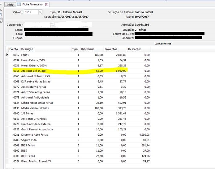 Problema: Problema: Observou que no cálculo da folha, alguns colaboradores que estão com 30 dias de férias e possuem atestado médico no mês anterior, o Administração de Pessoal está gerando também o pagamento das horas de atestado, exemplo em anexo.