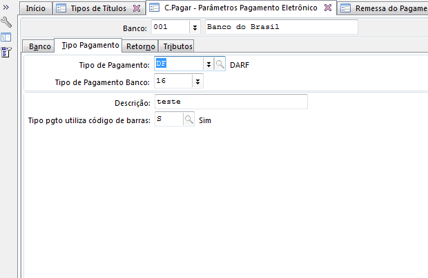 Problema: Precisamos inserir um título referente a DARF com código de barras na remessa do pagamento eletrônico, porém ao digitar o tipo de pagamento DF na grid e digitar o código de barras o tipo DF é alterado para TN.