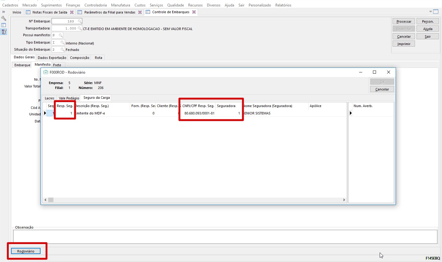 Mercado > Gestão de Faturamento e Outras Saídas > Notas Fiscais de Saída > Geração controle Embarque (F145EBQ)