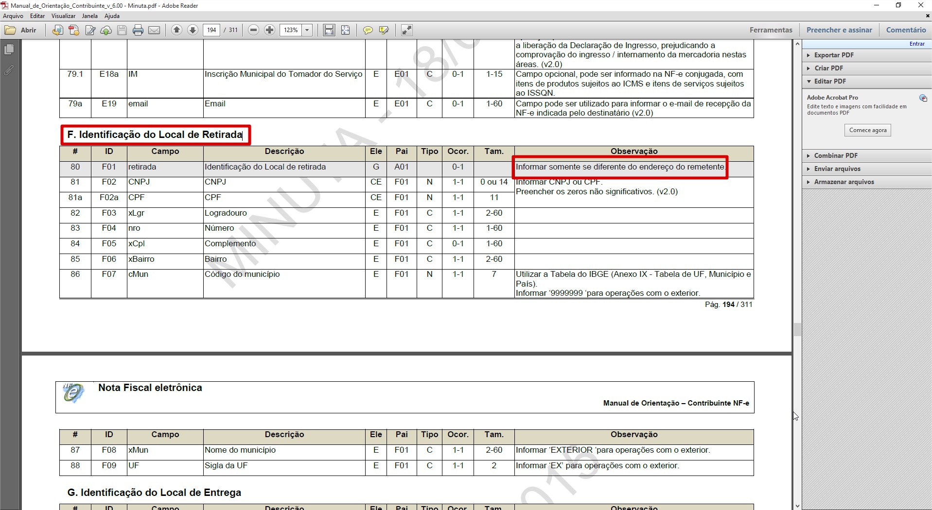 Problema: Descrição do Problema: De que forma o ERP faz a geração do grupo de informações <retirada> no XML da NF-e?