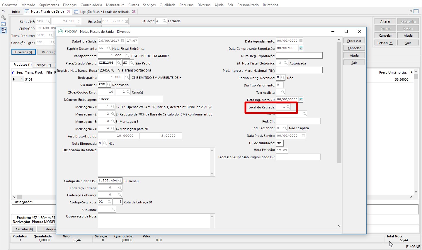 Solução: Solução 19945: Essa informação é gerada no XML conforme o código informado no botão Diversos da tela F140GNF destacado no anexo (1- F140DIV.jpg). A informação do endereço de retirada é cadastrado na tela F070RET - Cadastros / Mercado e Suprimentos / Local de Retirada X Filiais. Após cadastrar o endereço na aba Dados gerais é necessário ir na aba Local de retirada X Filiais e fazer a ligação com a empresa/filial que irá utilizar o cadastro.