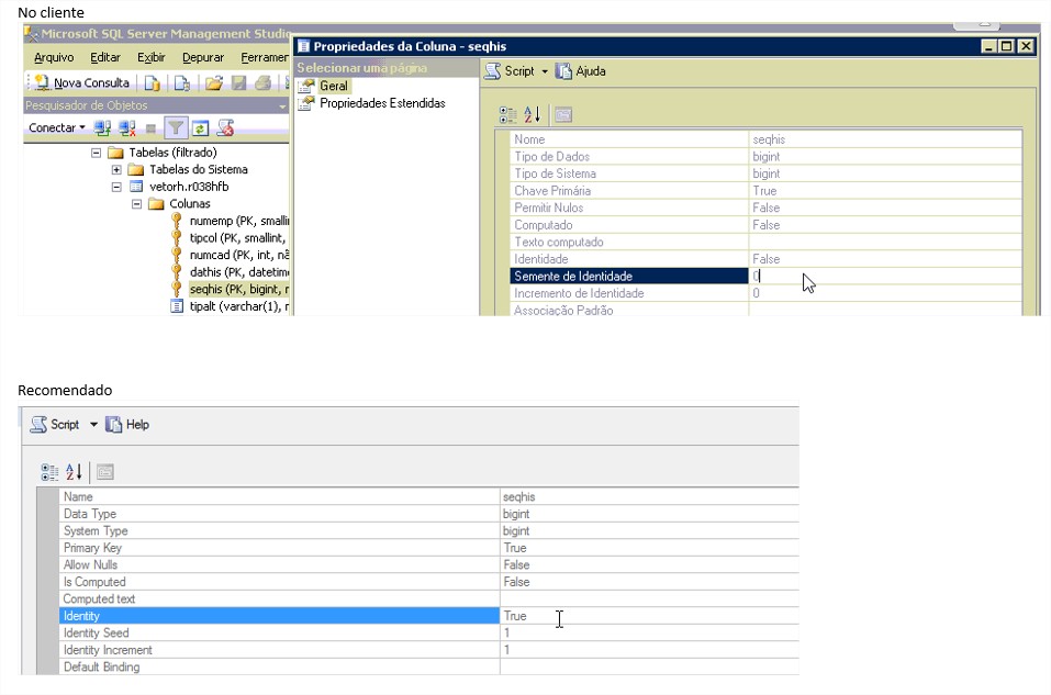 O Campo está como Identidade False quando o nosso padrão é True, é necessário acionar o DBA para ajustar essa informação.