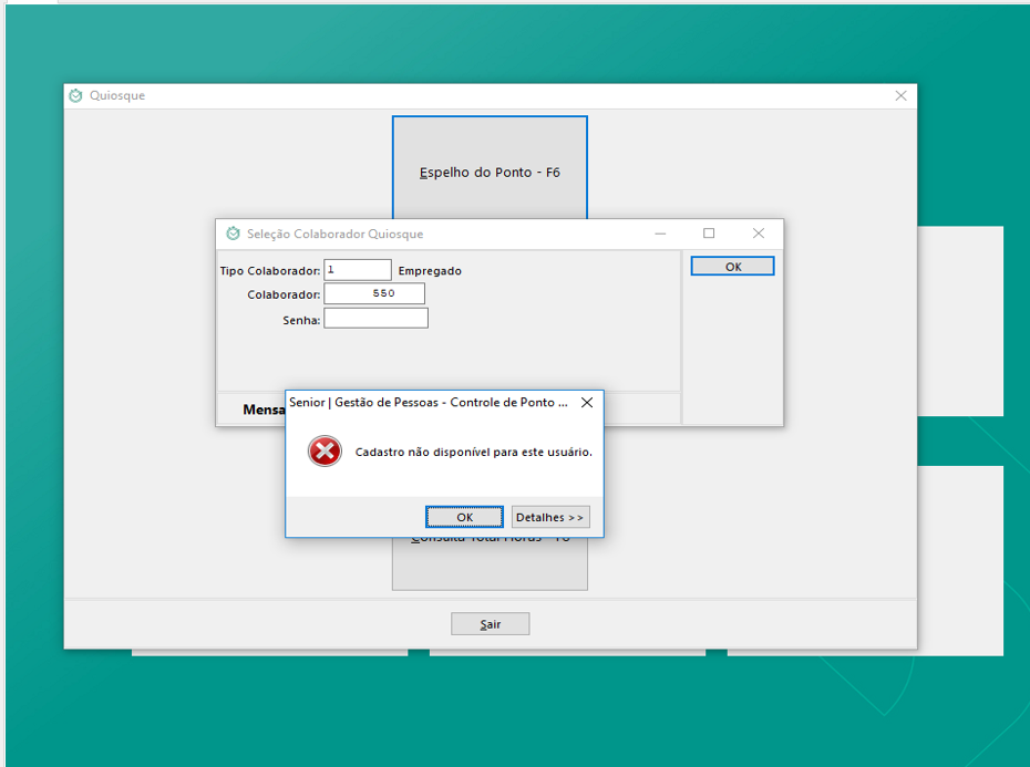 Problema: Descrição do Problema: No Controle de Ponto em diversos > quiosque > quiosque, ao clicar no ícone do espelho ponto e informar o cadastro e teclar <enter> ocorre a mensagem Cadastro não disponível para este usuário. O usuário logado tem permissão e abrangência.